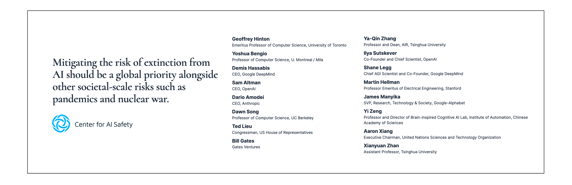 Hinton har bland annat varit en av många andra experter som skrivit under ett "Statement on AI Risk" som Centre for AI Safety står bakom (30 maj 2023).