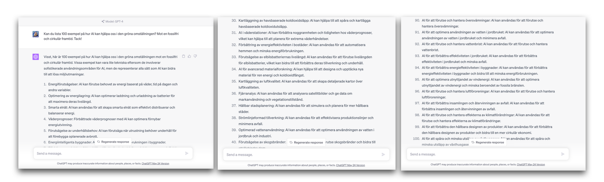 "Kan du lista 100 exempel på hur AI kan hjälpa oss i den gröna omställningen? Mot en fossilfri och cirkulär framtid. Tack!"