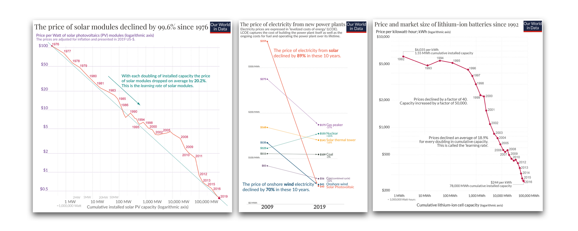 Detta ser vi bland annat tydligt när det kommer till utvecklingen av energi från fossilfria källor och batteriteknik. I de hoppingivande graferna här under illustreras hur priserna kraftigt har fallit över tid.