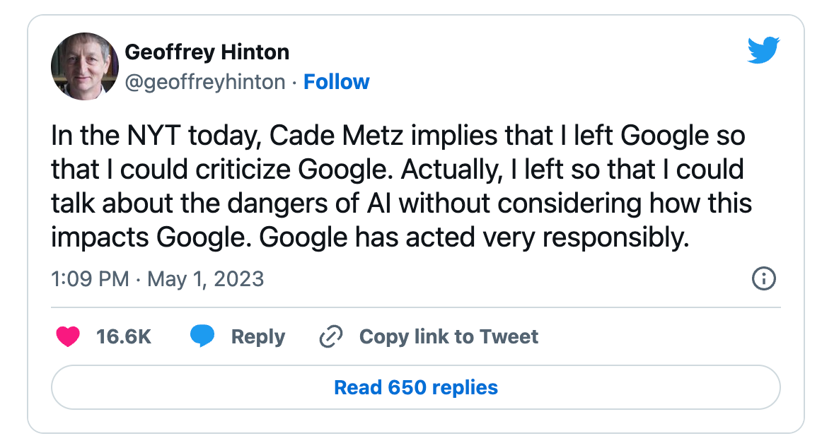 I början av maj 2023 sa ”the godfather of AI” upp sig från Google för att även han skulle kunna ansluta sig till skaran som varnar för farorna. Denna gudfader heter Geoffrey Hinton och är en av nyckelpersonerna bakom den imponerande utvecklingen inom djupinlärning och det man kallar för neurala nätverk. Mer avancerade former av AI som bland annat ligger till grund för ChatGPT och Google Bard.